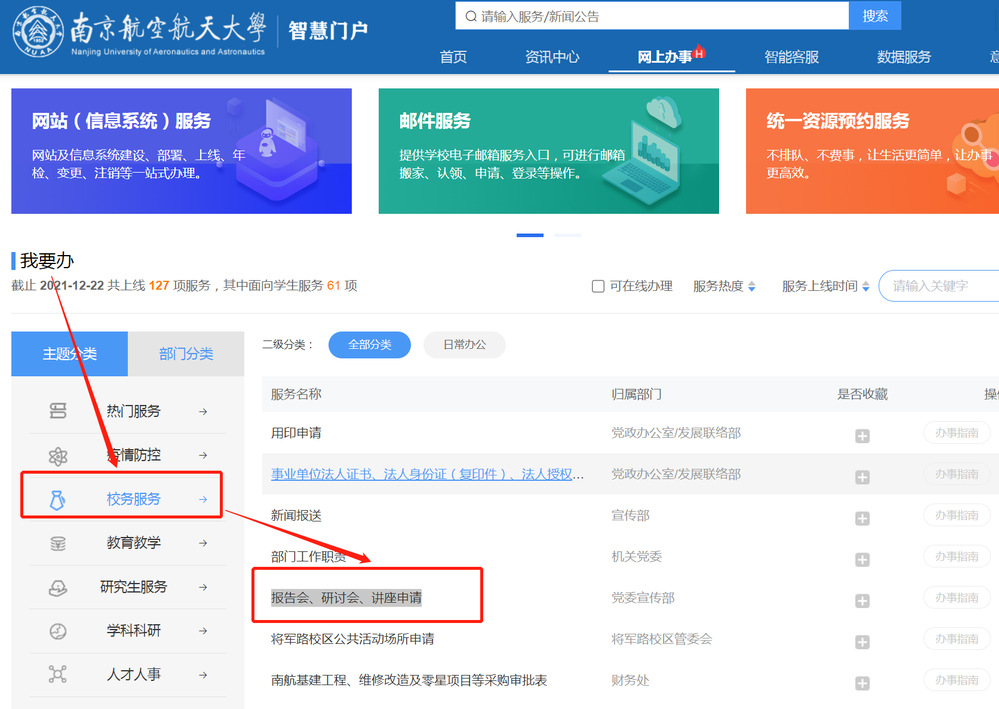1. 登录学校智慧门户-网上办事大厅,网址:http://i.nuaa.edu.cn/web/onlineService/,在“我要办”栏目版块选择“校务服务”,然后选择“报告会、研讨会、讲座申请”事项。