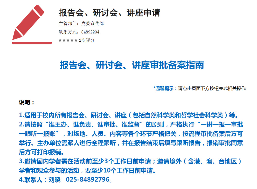 根据上级部门相关工作要求,为了进一步规范校内学术交流活动(适用于校内所有报告会、研讨会、讲座等)的开展,即日起,学院老师邀请校外专家举办学术讲座、主承办学术会议(研讨会),都需经过线上审批流程。邀请国内学者需在活动前至少 3 个工作日前申请;邀请境外(含港、澳、台地区)学者和观众参与的活动,要至少 10 个工作日前申请。