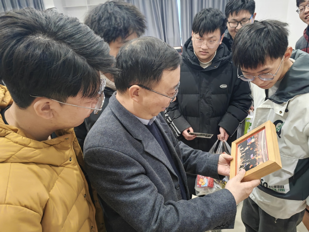 交流后,姜斌为同学们送上精心准备的礼物,分别是极具意义的南航70周年纪念版笔记本和充满关爱的生活大礼包,勉励同学们努力学习,多多参加文体活动,在强健体魄的同时丰富与提升自己的精神世界。同学们也纷纷递上了写满心里话的祝福卡片,并将上学期期末与姜老师的合影精心装裱、隽印祝福后送姜老师。