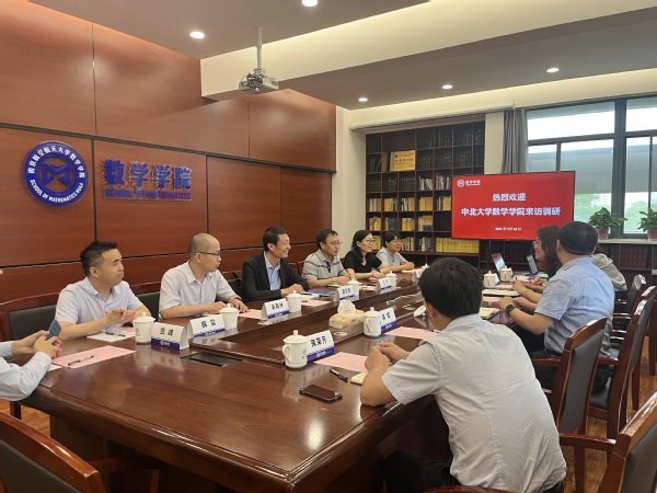 5月30日上午,中北大学德赢winac米兰党委书记薛亚奎、副院长王鹏、副院长吴森林、大学数学教学中心主任宋妮、计算科学系主任薛震、概率统计系主任张峰、办公室主任张鹏娟一行来访德赢winac米兰。德赢winac米兰党委书记许静、院长王春武、党委副书记周佼佼、计算科学系主任龚荣芳、概率统计系主任蒋辉、办公室主任卢逸参加调研座谈。