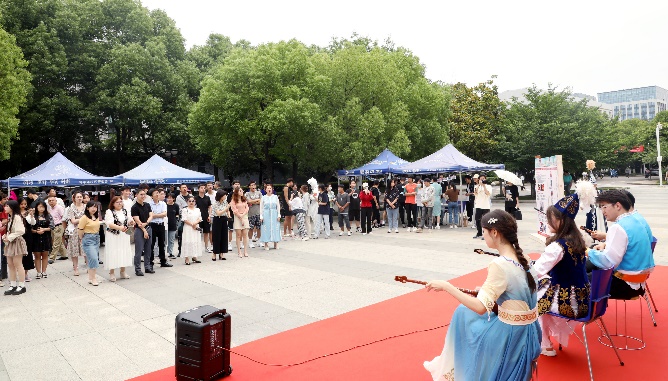 民族团结主题图片展跨越时空,为师生讲述“民族团结佳话”、展示“民族先锋事迹”、传递“身边榜样力量”、共建“南航和谐家园”。民族器乐展区上演师生精心编排的《喀秋莎》、《白羊岭》等节目,展现冬不拉、手风琴、热瓦普等乐器的别样魅力,吸引往来师生驻足观看。随着维吾尔族舞蹈、哈萨克族“黑走马”的热情节奏,现场师生欢乐共舞,沉浸式体会民族精粹。活动现场还展示了绚丽缤纷的民族服饰、特色民族物件等展品,师生近距离感悟民族文化深厚的底蕴和内涵,并在趣味民族游戏和丰盛的民族美食中,共享悠久灿烂的各民族文化。