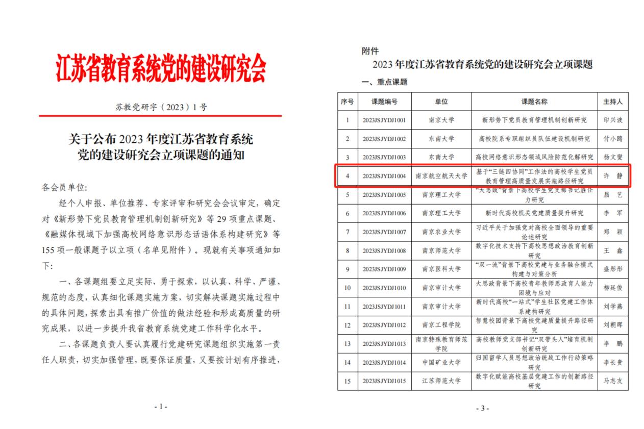 近日,江苏省教育系统党的建设研究会发布了《关于公布 2023 年度江苏省教育系统党的建设研究会立项课题的通知》,经个人申报、单位推荐、专家评审和研究会会议审定,德赢申报的《基于“三链四协同”工作法的高校学生党员教育管理高质量发展实施路径研究》获重点课题立项(29项)。