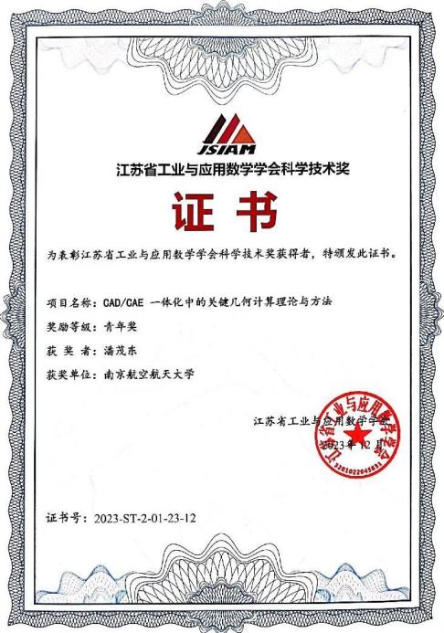 12月23-24日,江苏省工业与应用数学学会2023年学术年会在南京理工大学召开,会上颁发了第六届江苏省工业与应用数学学会科学技术奖。德赢潘茂东老师申报的“CAD/CAE 一体化中的关键几何计算理论与方法”项目荣获江苏省工业与应用数学学会科学技术奖-青年奖,并做了题为“面向CAD/CAE一体化的关键几何计算理论”大会特邀报告。