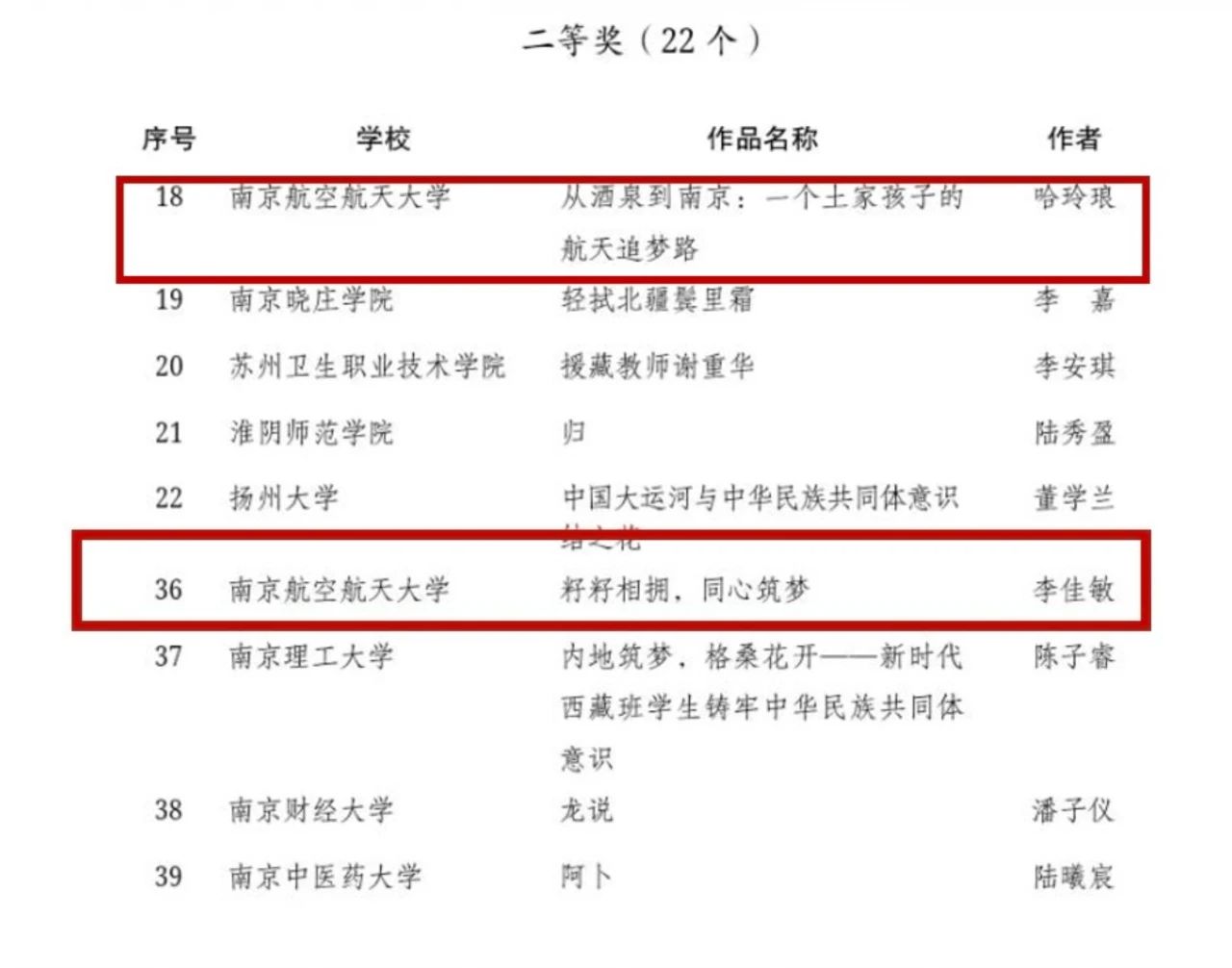 日前,由江苏省民族宗教事务委员会、中共江苏省委宣传部、中共江苏省委统一战线工作部、江苏省教育厅共同主办的江苏省第一届“铸牢中华民族共同体意识·高校在行动”系列活动获奖名单公布,南航学子获得优秀成绩。其中,德赢学子投稿的《从酒泉到南京:一个土族孩子的航天追梦路》、《籽籽相拥,同心筑梦》均获征文比赛(普通类)二等奖,为我校在该序列的最高获奖等次。该系列活动征文中,全省共有98所高校推荐474篇稿件参评,普通类征文共评定二等奖22篇。