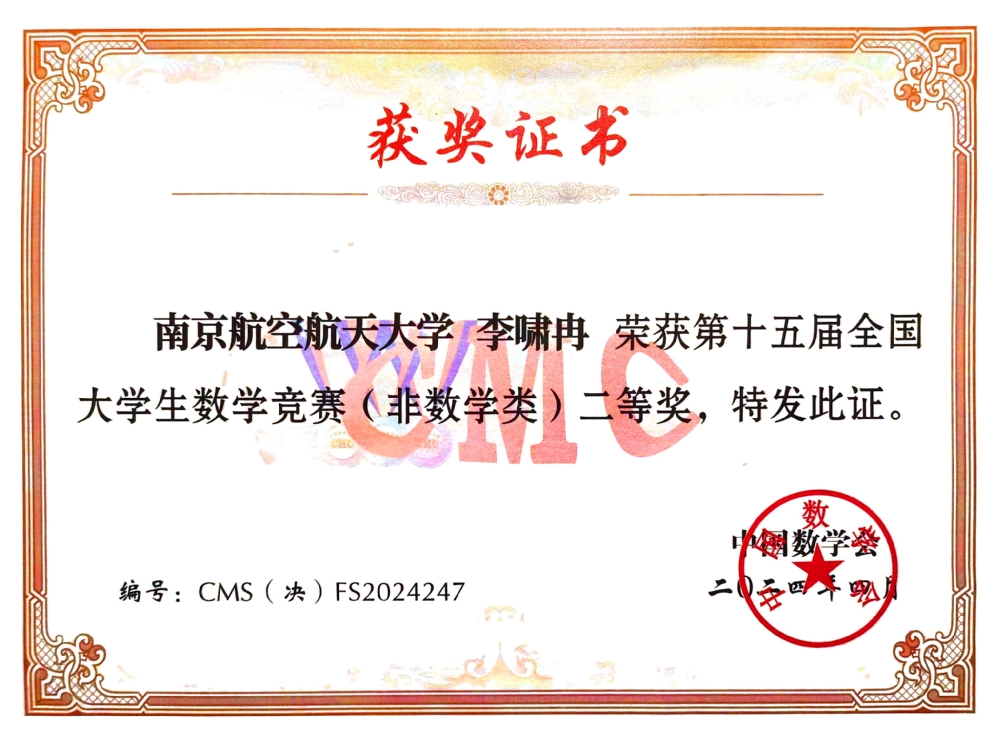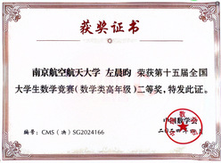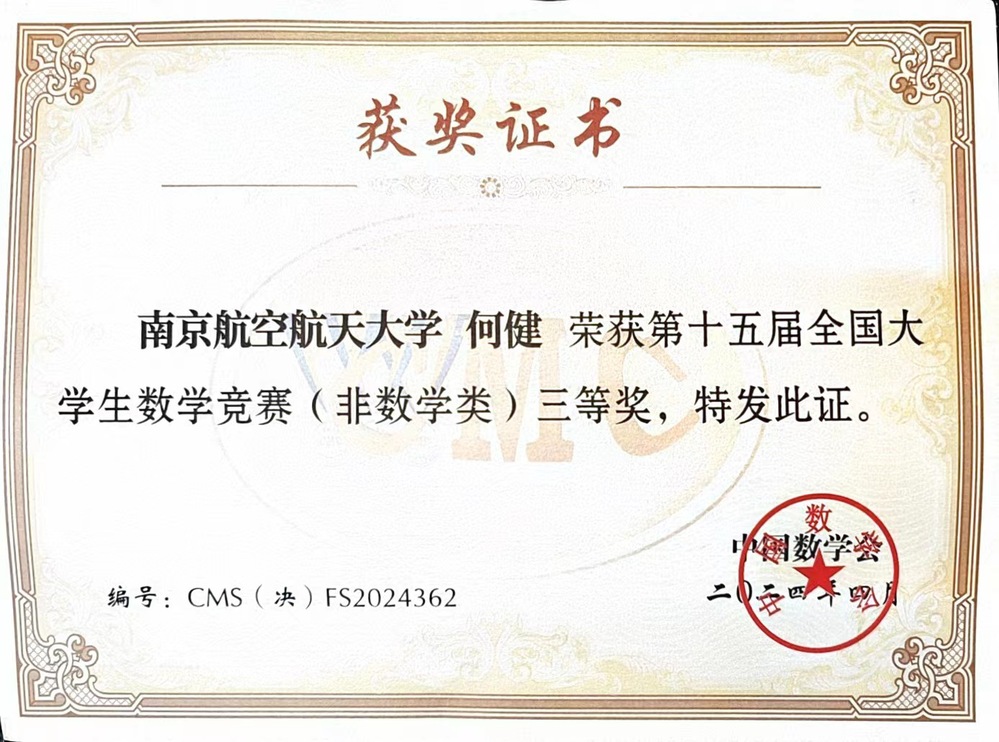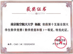 2024年4月19至21日,第十五届全国大学生数学竞赛决赛及颁奖大会在山东大学举行。我校共有4名同学进入决赛,经过激励的角逐,德赢winac米兰应用统计学专业大二学生杨航同学荣获数学类低年级组一等奖,应用统计学专业大三学生左晨昀同学荣获数学类高年级组二等奖;航天学院李啸冉同学和物理学院何健同学分别荣获非数学类二等奖、三等奖。江苏省高校共获得数学类低年级组一等奖4项,我校摘得1项,这也是德赢winac米兰学子首次在该组别中获全国一等奖,取得了突破性成绩。