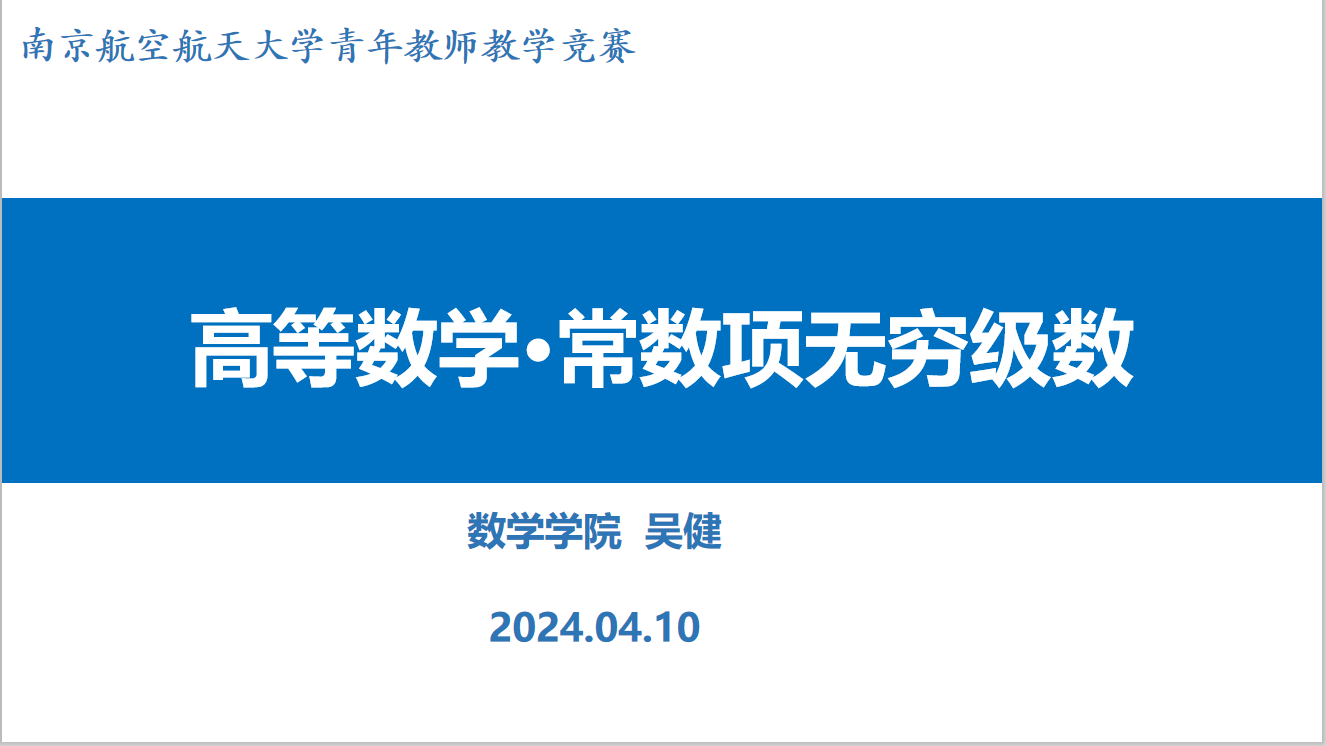 吴健老师本次所抽取的课程内容为《高等数学·常数项无穷级数》,课程首先通过芝诺的两分法论述结合生活中的实际问题导入无穷级数的定义,在BOPPPS教学过程中,采用以探究实际问题为目标的目标导向式闭环教学,并采用3W1H提问式互动,将思政元素与课程内容自然融合。在激发学生积极性的同时,还注重培养学生的数学建模能力,科学分析问题、解决问题的能力。