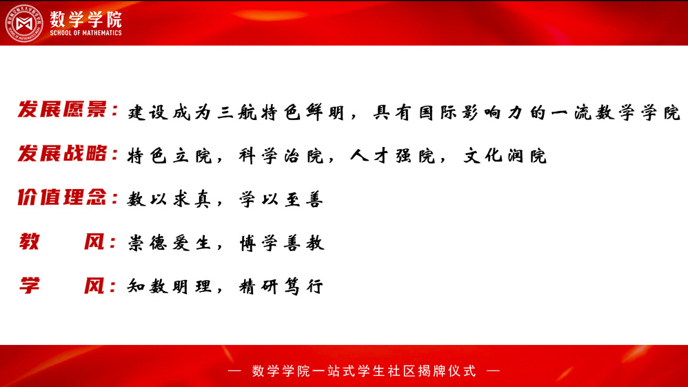 揭牌仪式上,学院“五位一体”的精神表达体系正式发布。其中,“数以求真,学以至善”的价值理念意在勉励全院师生崇尚真理、严谨治学,教人求真、学做真人,为善不移、守善不渝,在治学为人中孜孜追求,达到至善至美的最高境界。