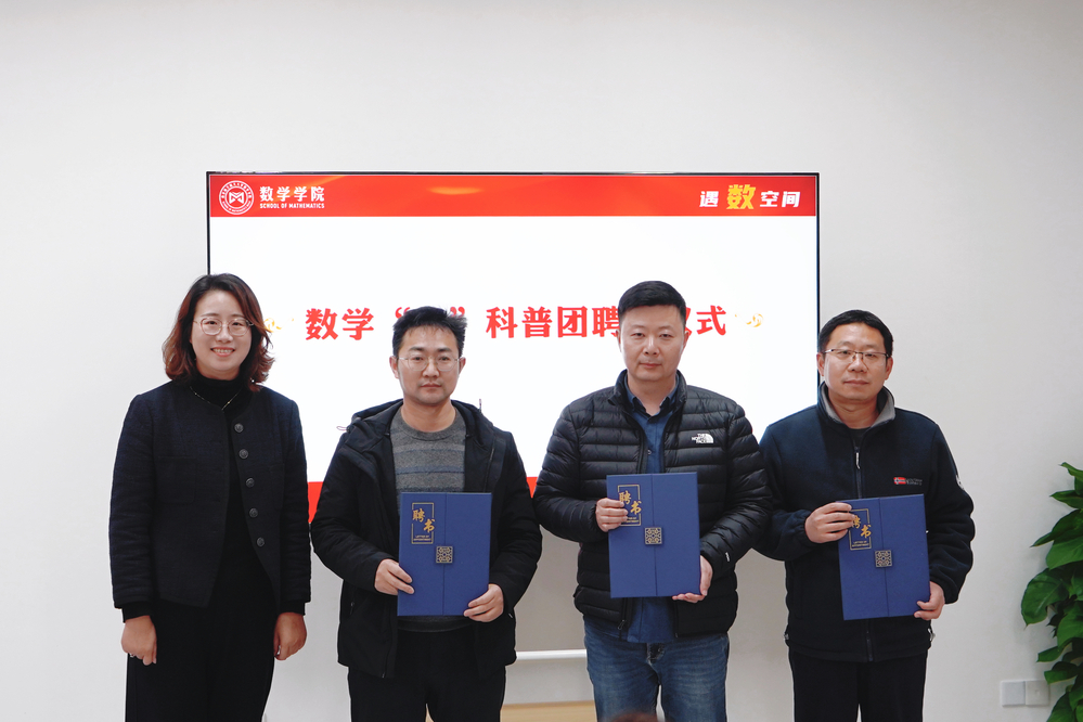 依托学生社区建设,学院精心筹备、组建了由学院师生共同组成的数学“π”科普团,团队将面向大中小学传播数学知识,弘扬数学文化,让更多人感受数学魅力。许静为数学“π”科普团首批教师成员蒋辉、龚荣芳、曹峰颁发聘书。