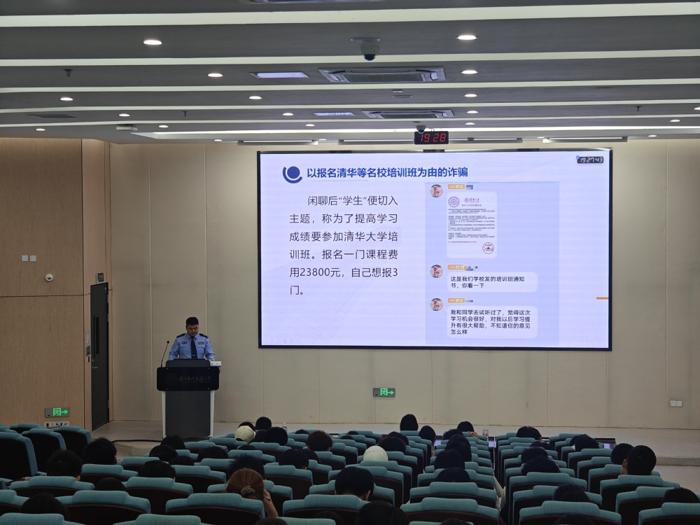 为有效提升学生对电信网络诈骗的识别和防范能力,营造安全和谐的校园环境,5月14日晚,德赢winac米兰在天目湖校区牧星楼T2110教室举办“天目护航”防诈安全教育专题讲座。古县派出所民警兼德赢winac米兰法制辅导员鲍力主讲,学院党委副书记王亚鹏、2024级辅导员赵美婷、迪丽以及2024级全体本、预科生到场参加。