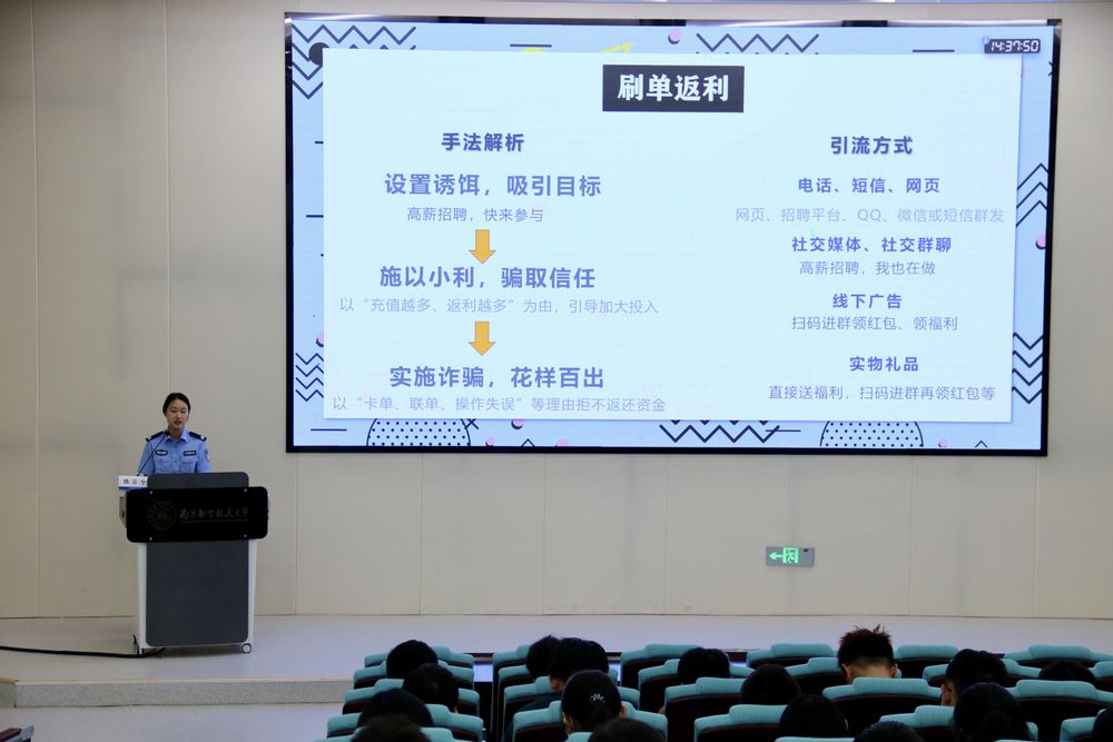 滕警官围绕“什么是电诈”进行了详细阐述,列举了电信诈骗的六个特点,介绍了常见电信诈骗的几种类型,并结合例如刷单返利、网络虚假产品交易、裸聊诈骗等具体真实案例进行了深度剖析,使学生深刻认识到网络诈骗的多样性和隐蔽性。此外,她还现场教授学生反诈指南,帮助同学们掌握可靠的识破骗局、规避风险的办法举措。
