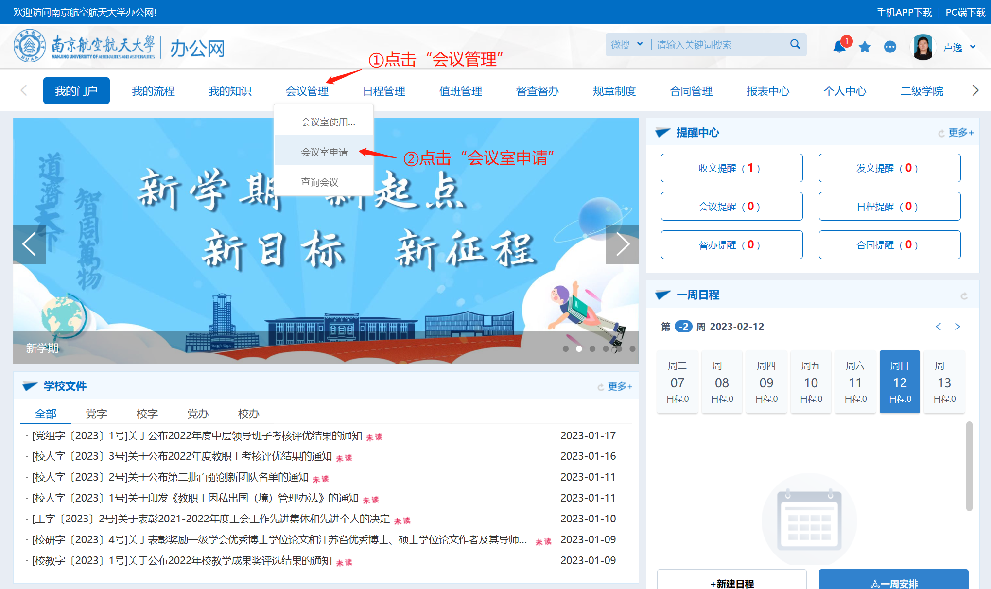 OA系统依次点击“会议管理”-“会议室申请”。